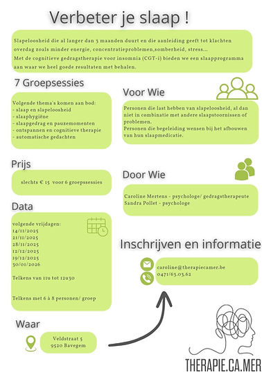 Wij bieden een groepstraining 'VERBETER JE SLAAP' aan waarin je aan de hand van de cognitieve gedragstherapie voor insomnia (CGT-i) een slaapprogramma volgt met goede resultaten.